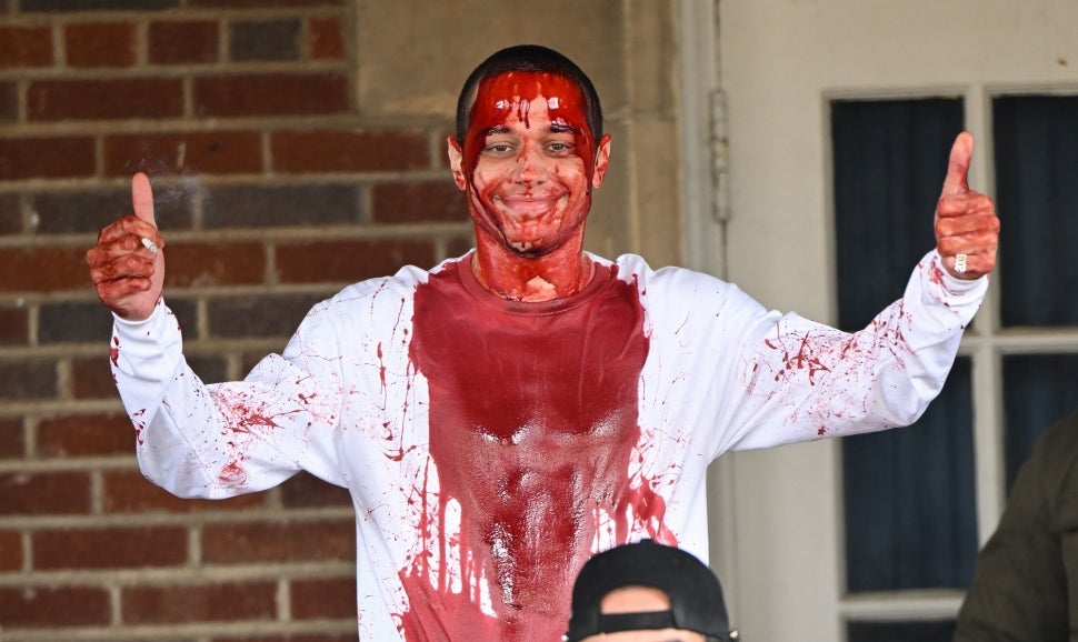 Covered in blood and loving it! Pete Davidson was spotted drenched in prop blood on the set of his new film on Monday, and appeared to be in good spirits as he smiled for photographers.
