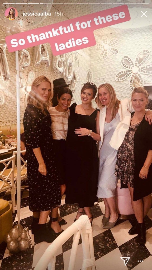 Alba posted several Instagram stories throughout the day, which featured the Honest Company founder in a chic black maternity dress, jeweled headband and winged eyeliner applied by her glam team.