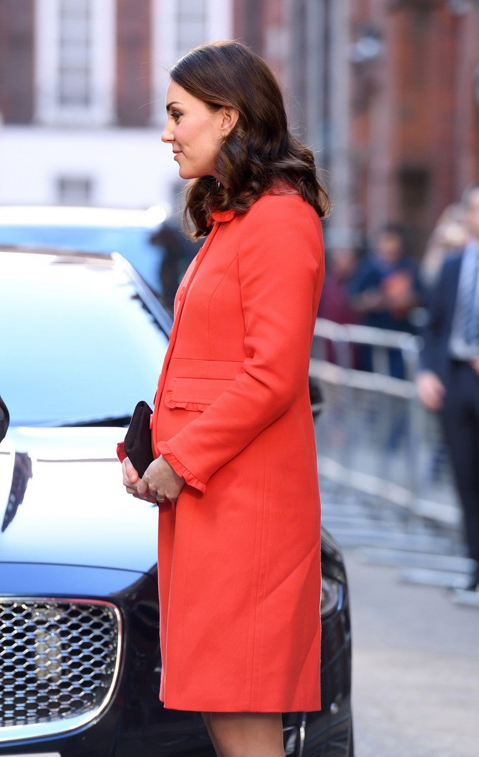 Clad in a tangerine-colored peacoat and a peach dress, Kate’s tiny baby bump was just visible as she was greeted by a 9-year-old patient named Ava, who handed her a teddy bear, presumably for her third child, who is set to arrive this April.