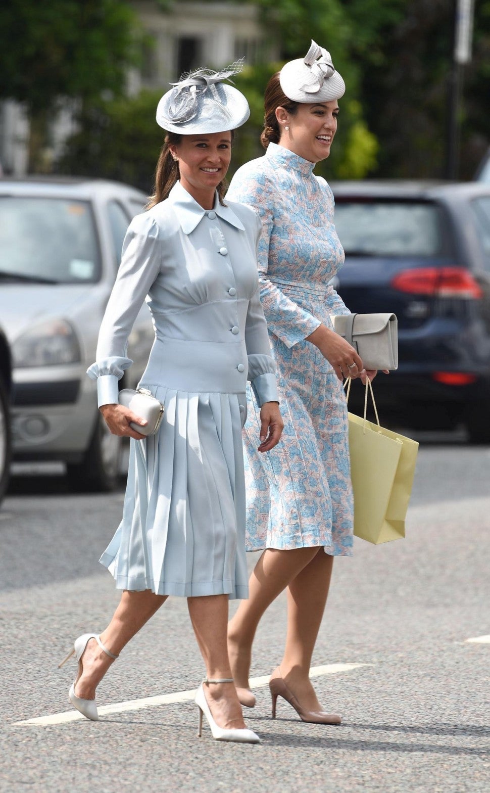 The younger sister of Kate Middleton wore a collared, powder blue Alessandra Rich dress, which slightly gave fans a peek at her growing baby bump. She completed the look with a matching fascinator, strappy white Jimmy Choo heels and a satin box clutch by the same designer.