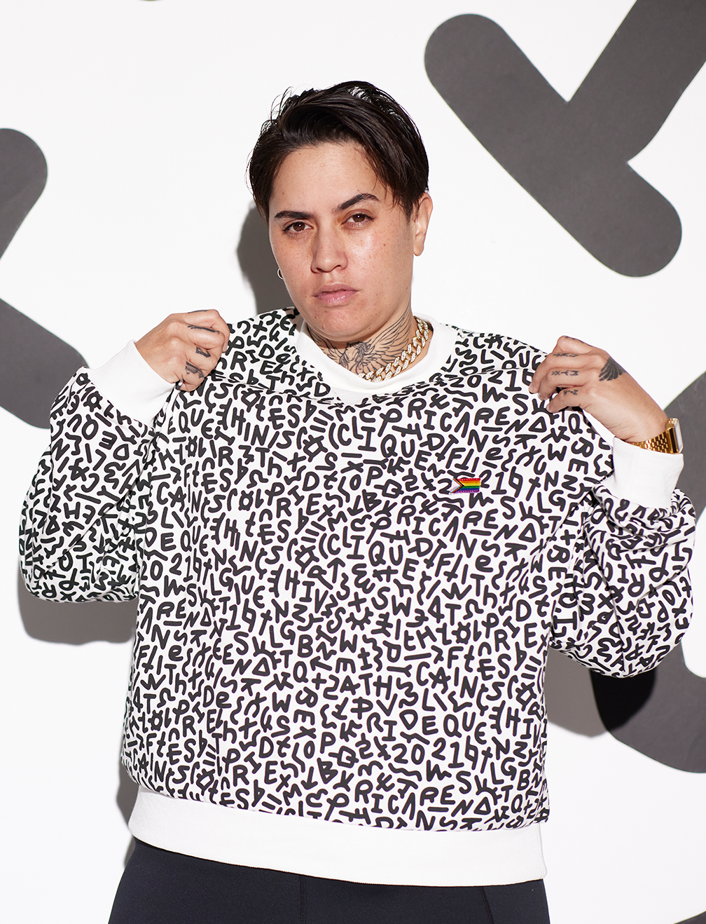 Clique and Oliver Cain came together to create this bold and fun sweater and nestled in the design is a beautifully embroidered rainbow flag. Their collab emphasizes the importance of mental and physical health in LGBTQI+ communities and all of the proceeds go to projects in New Zealand that specifically uplift queer communities.