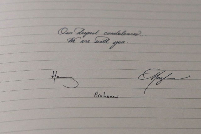 Wearing a dark blue suit, Harry laid some flowers outside and his wife, who's expecting her first child late next month, scrawled a brief message in a book of condolences, offering some comfort.