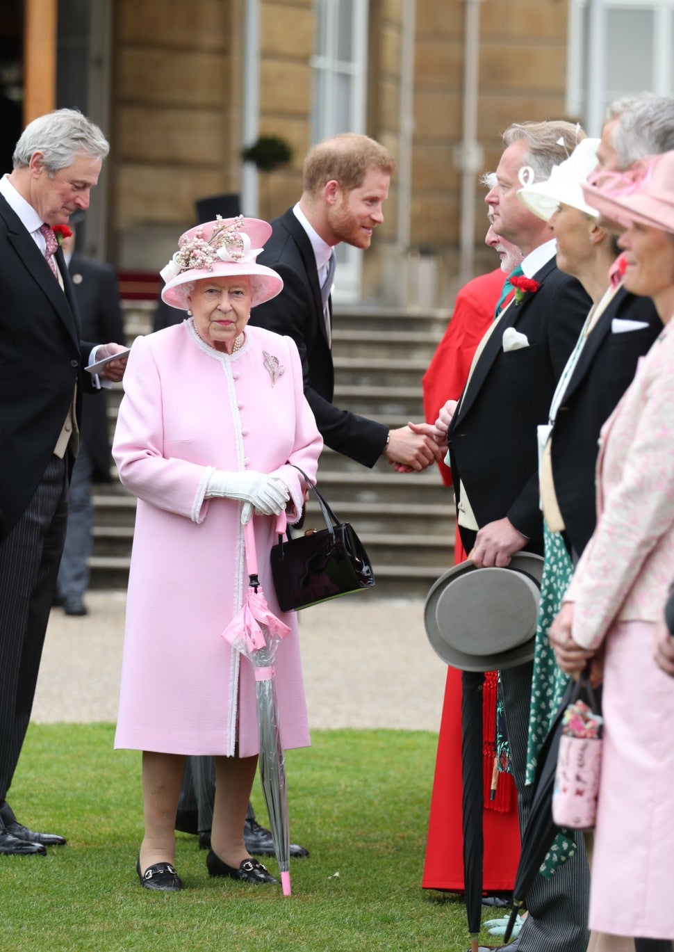 The prince left his secluded residence at Frogmore Cottage on the grounds of Windsor Castle on Wednesday to attend his grandmother's third garden party of the year at Buckingham Palace. Sporting formal attire for the old-fashioned outing, including a top hat and tails, Harry greeted guests alongside the queen, who chose a bright pink ensemble for the gathering.