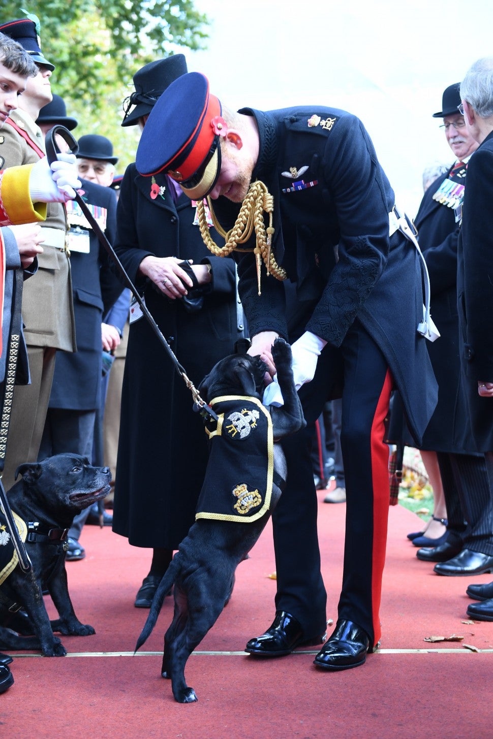 In between greeting veterans and laying a wooden cross in remembrance of the fallen, Harry had an adorable moment with some dogs in attendance. Dressed in full uniform -- including white gloves -- the soon-to-be dad crouched down to pet two black dogs. The pups were clearly thrilled with the attention, jumping up to greet Harry.