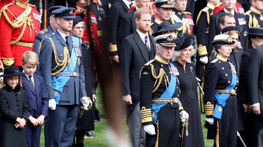 During Monday's historical state funeral, Charles appeared to be blinking back tears. He was joined by wife Camilla, the Queen Consort, and his children, Prince William -- with his wife and two eldest children, Prince George and Princess Charlotte -- and Prince Harry with Meghan Markle.