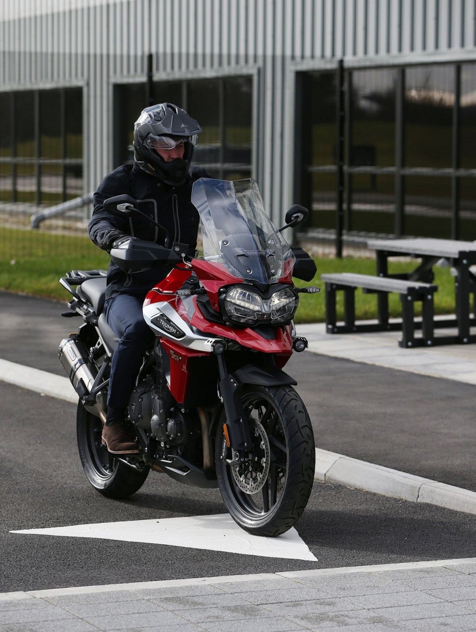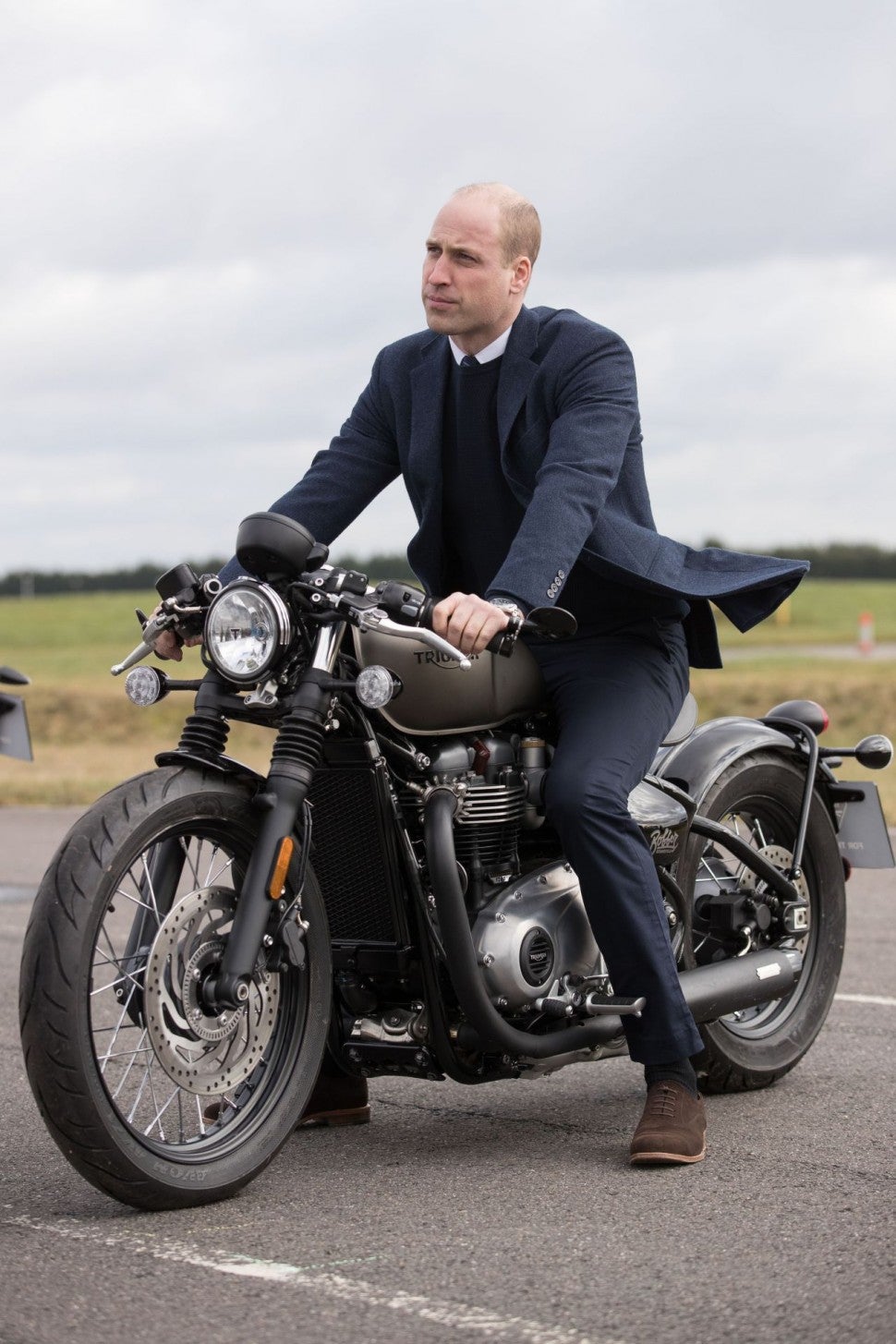 Later, William traded in his blazer for an edgy black motorcycle jacket and helmet as he took a test drive on a red Triumph Tiger 1200 while visiting the motorcycle's headquarters.