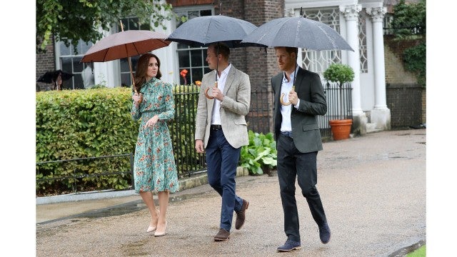 The brothers were joined by William's wife, Kate Middleton, who looked lovely in a green floral dress and L.K. Bennett nude pumps, and braved the rain as they strolled the grounds that have been transformed into the White Garden in honor of the late Princess of Wales.