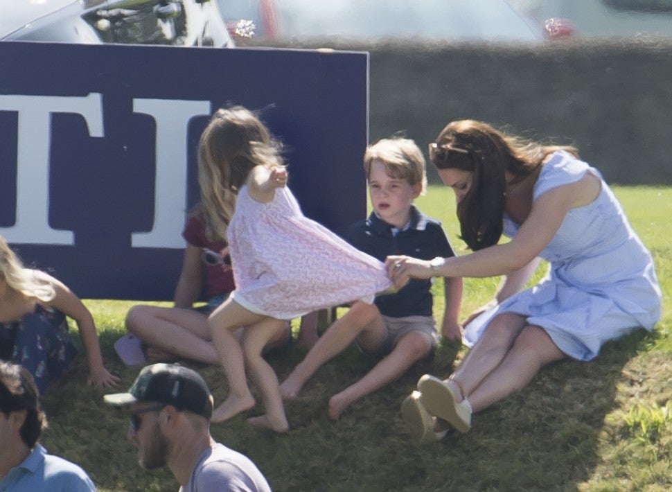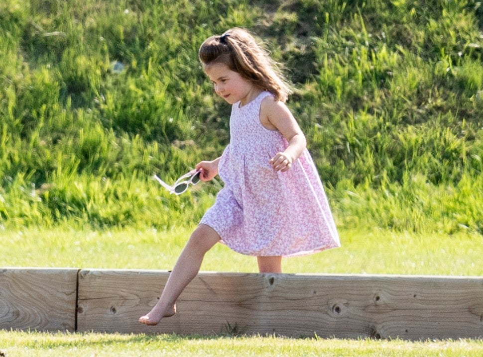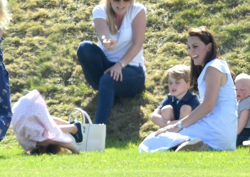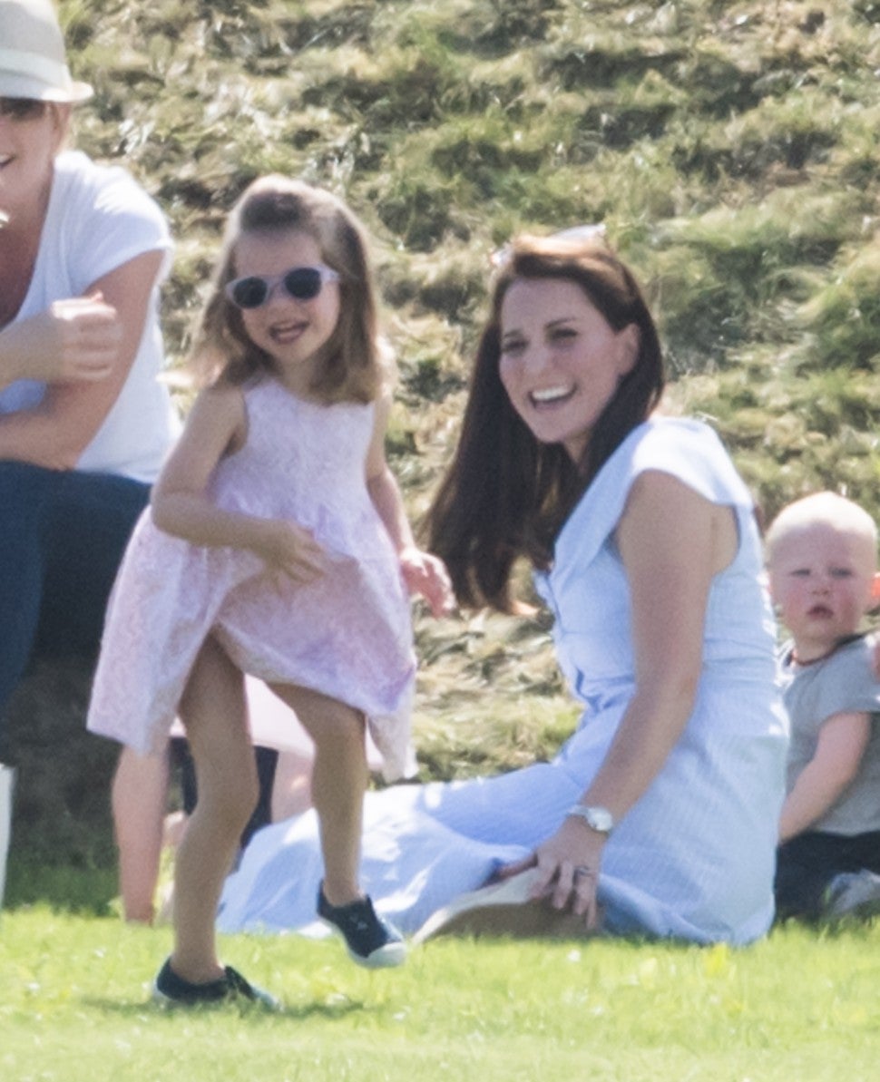 At the charity polo match, Charlotte — sporting a pink dress and matching sunglasses — attempted a somersault while mom Kate Middleton and 4-year-old brother Prince George watched in amusement.