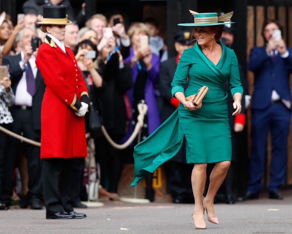 Fergie, who was married to Eugenie and Beatrice's father, Prince Andrew, from 1986 to 1996, turned heads long before the wedding was over, thanks to her standout style. The 58-year-old Duchess of York arrived at the ceremony with Beatrice and wore an emerald green dress by local Windsor company Emma Louise Design that paired perfectly with the bride's emerald tiara that was borrowed from Queen Elizabeth II. Fergie paired her dress with a vintage Manolo Blahnik bag and a matching green hat that featured a gold band along the brim that jetted out in the back.