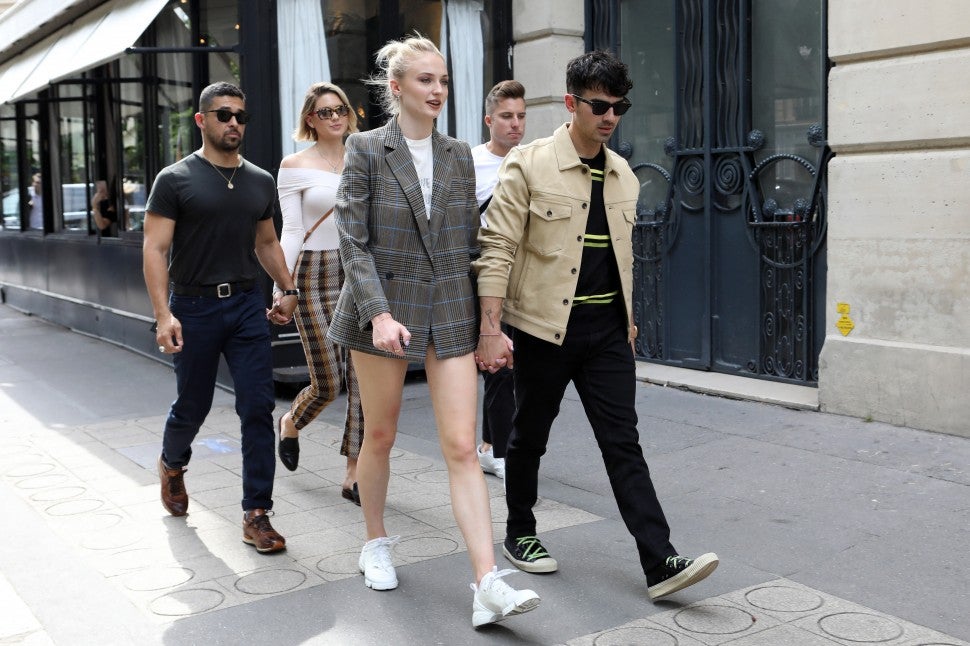 The groom’s brother and bandmate, Nick Jonas, was spotted walking Paris’ city streets with his wife, Priyanka Chopra, on Sunday. The crooner wore a matching light-pink denim ensemble over a tie-died tee, while the Quantico alum chose a loose-fitting white blouse and matching slacks for their day out in France’s capital.