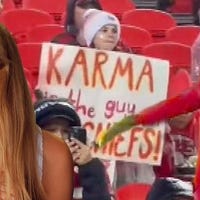 Travis Kelce acknowledged a Taylor Swift-themed sign in the crowd during warmups for the Kansas City Chiefs game on Monday.