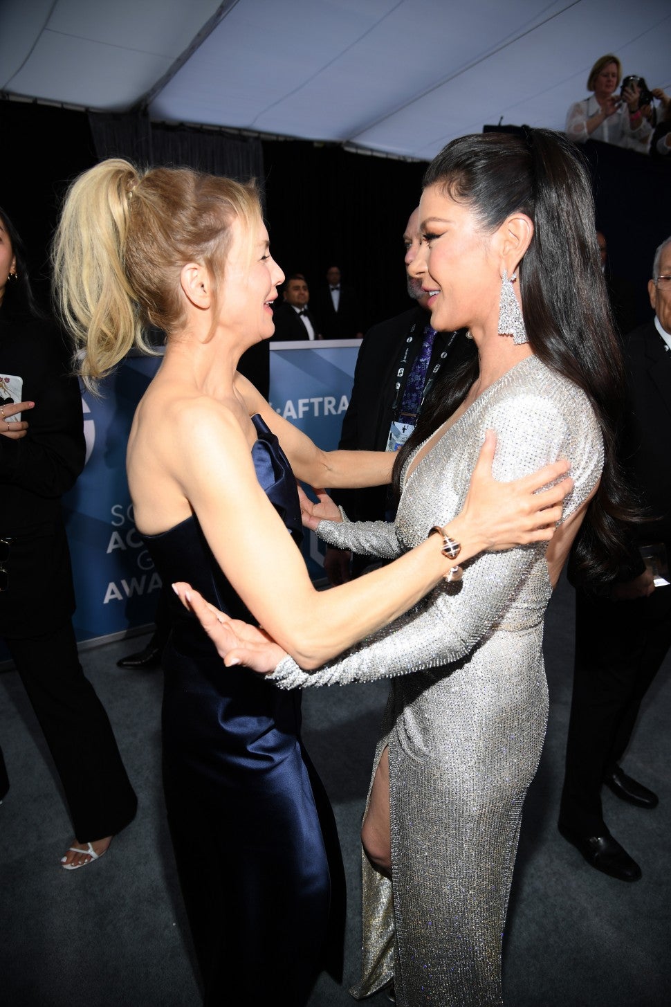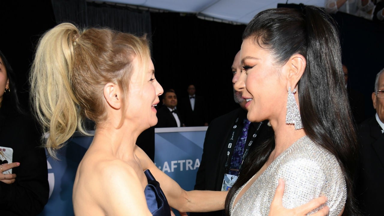 Zellweger, 50, who took home the SAG Award for her performance as Judy Garland in Judy, shared a laugh with Zeta-Jones, 50, backstage at the show. The pair were also photographed chatting with nominee Jennifer Lopez.
