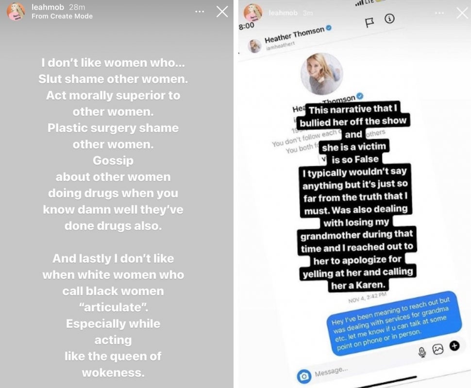 When news of Heather and Leah's tiff first hit the fan blogs, Leah posted (then deleted) a lengthy Instagram story which read, "I don't like women who slut shame other women, act morally superior to other women, plastic surgery shame other women, gossip about other women doing drugs when you know damn well they've done drugs also. And lastly, I don't like when white women call black women articulate, especially while acting like the queen of wokeness."