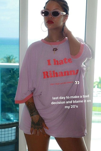 The R&B singer turned another year older on Tuesday, but prior to her monumental birthday, she was hell-bent on acting like a woman in her 20s. On her Instagram story, Rihanna posted a photo of her posing in an oversized pink T-shirt, with the message: "I hate Rihanna. Don't trust anyone under 30."