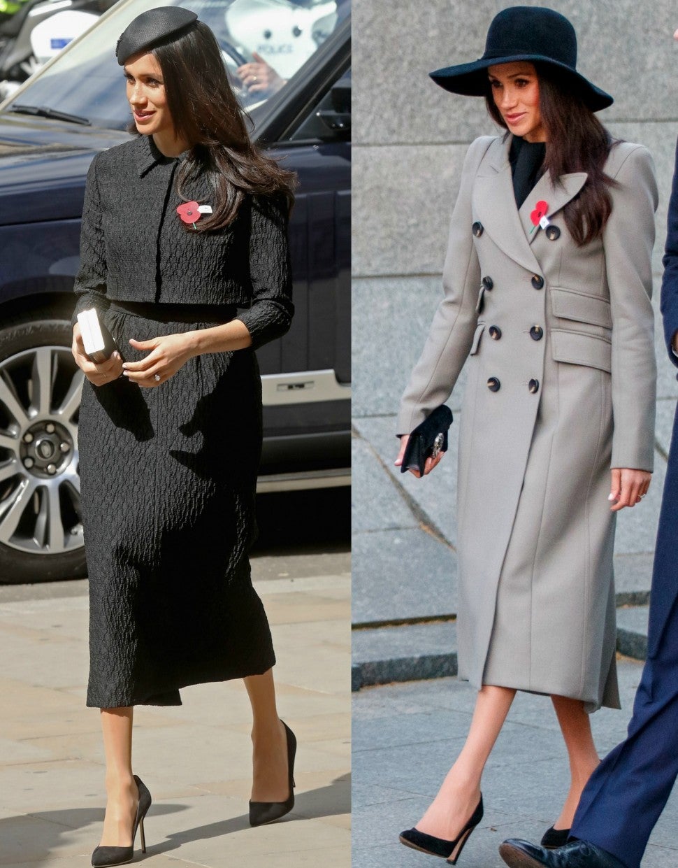 While stepping out to the Anzac Day service, the 36-year-old brunette beauty donned an elegant gray Smythe coat with a black dress underneath, Sarah Flint Jay heels, a Gucci Dionysus bag, a red poppy pin and a statement wide-brimmed, floppy hat. This type of hat is much simpler than the fancy fascinators and pillbox hats we typically see on royals like Queen Elizabeth II and the Duchess of Cambridge, but we love that Meghan put her own unique spin on the trend.