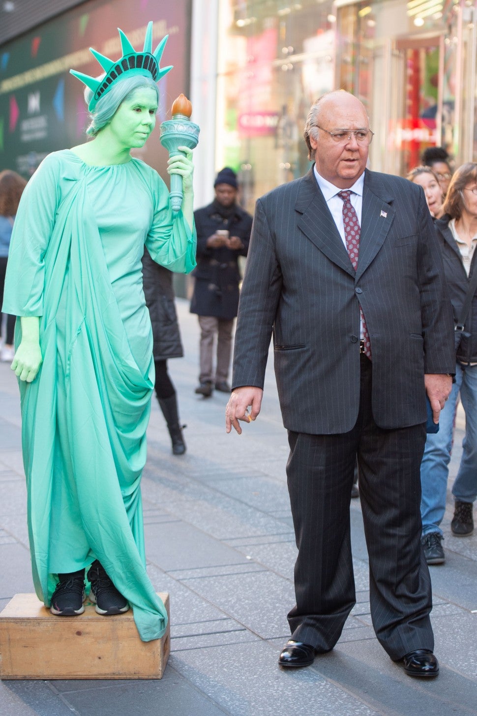 In the pics, the resemblance of the two men is uncanny. Crowe is seen wearing an ill-fitting striped suit with a red tie and light blue shirt, while also sporting a partially bald head and wire-rimmed glasses. Russell can be seen waving, walking down the sidewalk and standing alongside a person dressed as the Statue of Liberty in the shots.