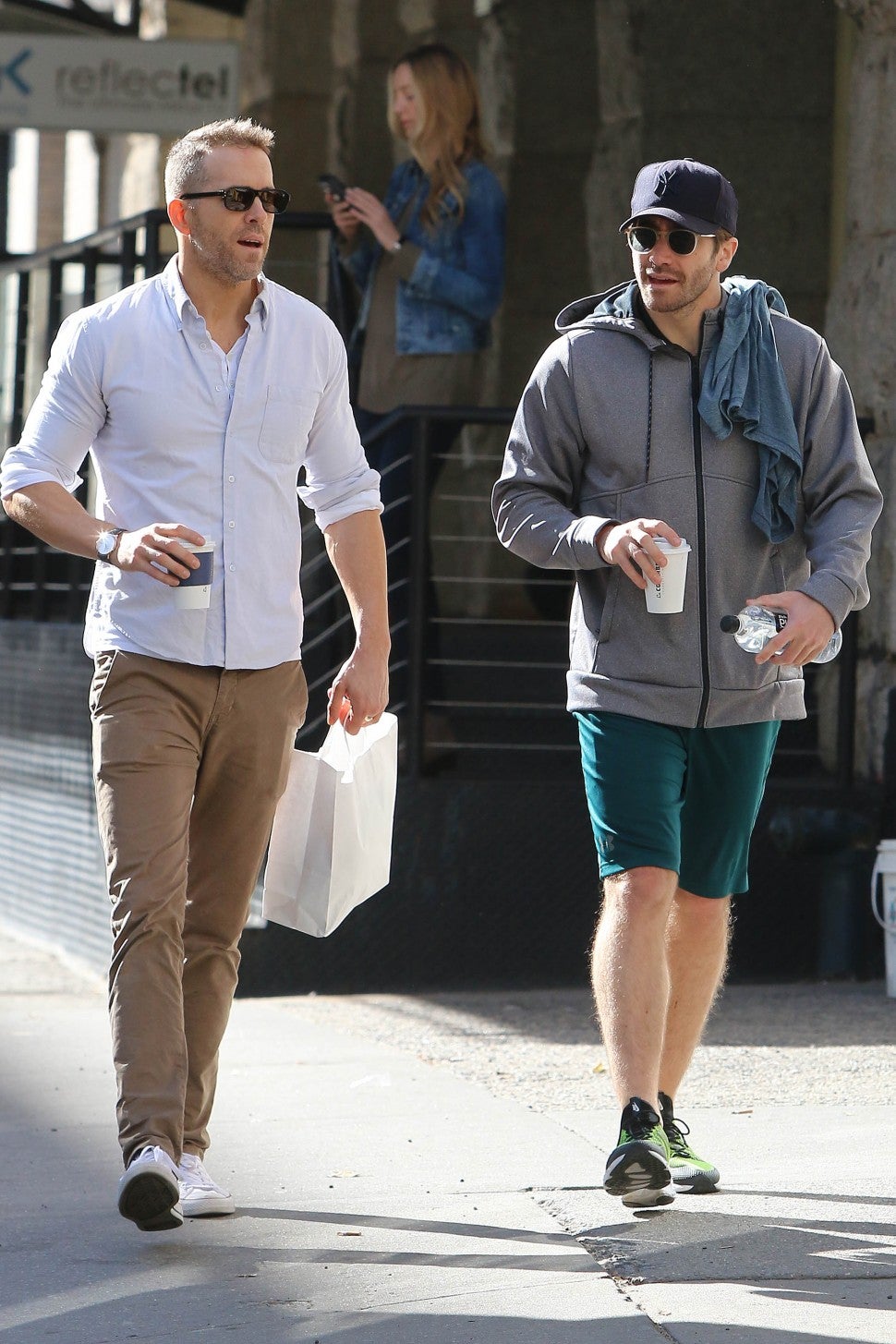 Reynolds looked casual in Converse, a button-up and cool shades, while Gyllenhaal appeared ready to hit the gym.