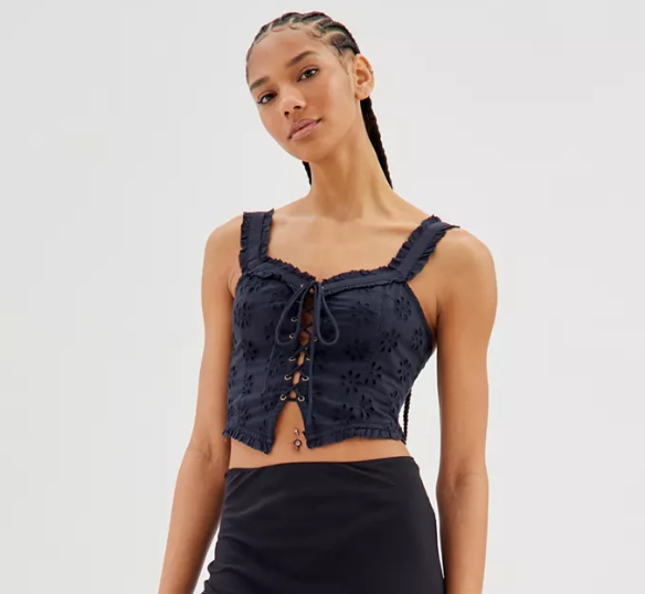 Made of 100% cotton, this flirty corset top has a smocked back, lace-up front and adjustable straps for the perfect fit.