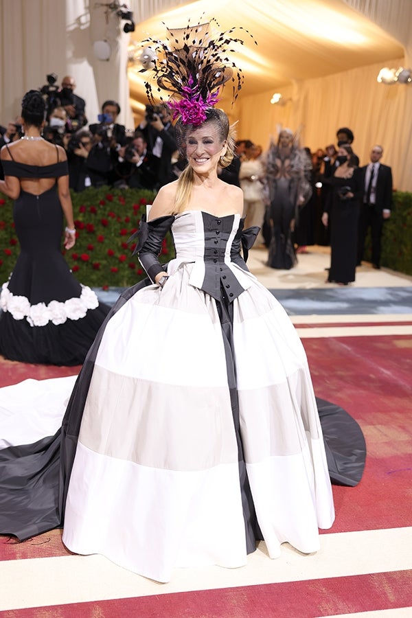 Sarah Jessica Parker wowed in a dramatic number complete with a headdress at the 2022 Met Gala on Monday.