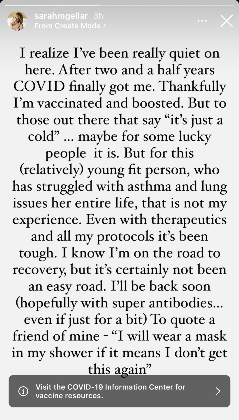 “I realize I've been really quiet on here. After two and a half years COVID finally got me. Thankfully I’m vaccinated and boosted,” she wrote. “But to those out there that say 'it’s just a cold' ...maybe for some lucky people it is. But for this (relatively) young fit person, who has struggled with asthma and lung issues her entire life, that is not my experience.”