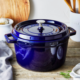 This hand-finished round cocotte from Staub is ideal for stews, soups, casseroles, roasts and braises. Its lid features self-basting spikes for continuous, even distribution of juices throughout cooking, so your food stays moist and flavorful.