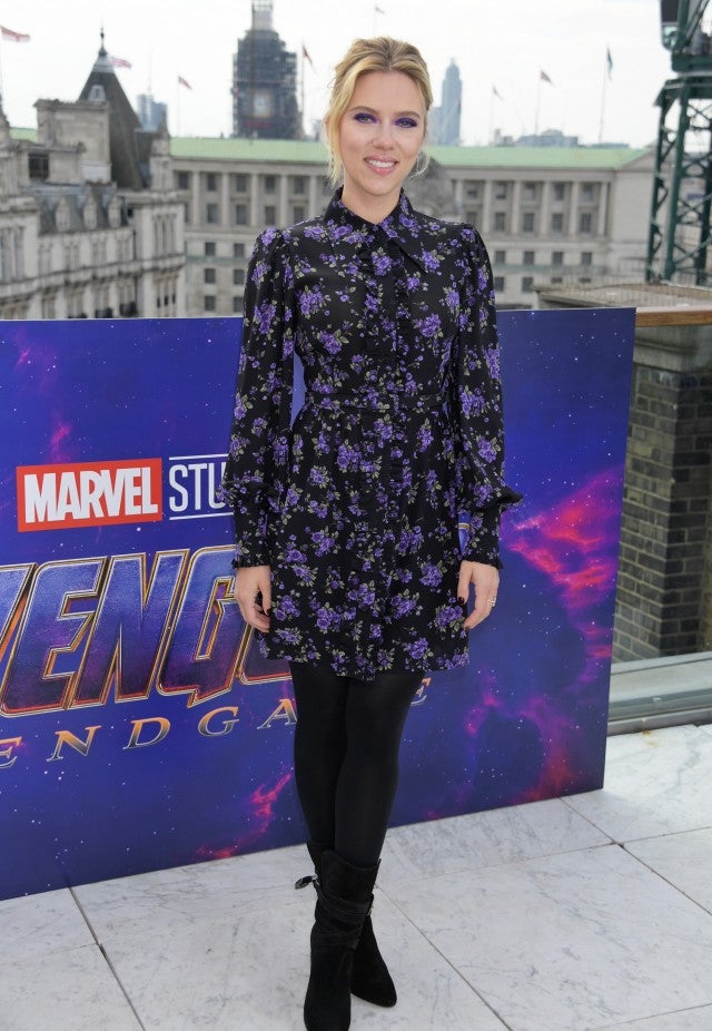 The 34-year-old actress smiled and waved for photographers during a photocall with her Avengers: Endgame co-stars, Chris Hemsworth and Paul Rudd, at the Corinthia London in London, England. Johansson wore a Michael Kors long-sleeved floral dress, black tights and ankle boots with a sky-high heel. She pulled the style together with purple eye shadow, a nude lip and a loose up 'do.