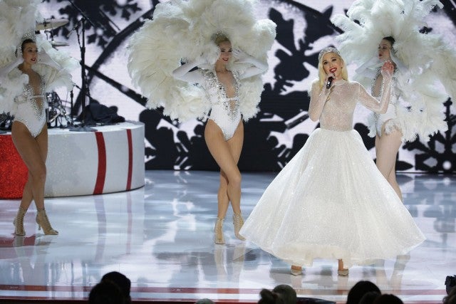 The No Doubt frontwoman kicked off the show as our perfect present, shimmying to the classic "Jingle Bells" in a candy cane-inspired silver-and-red sequined leotard topped with a red bow.
