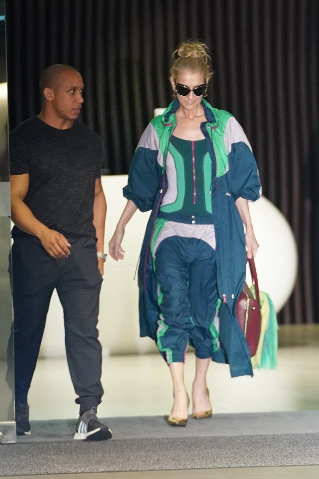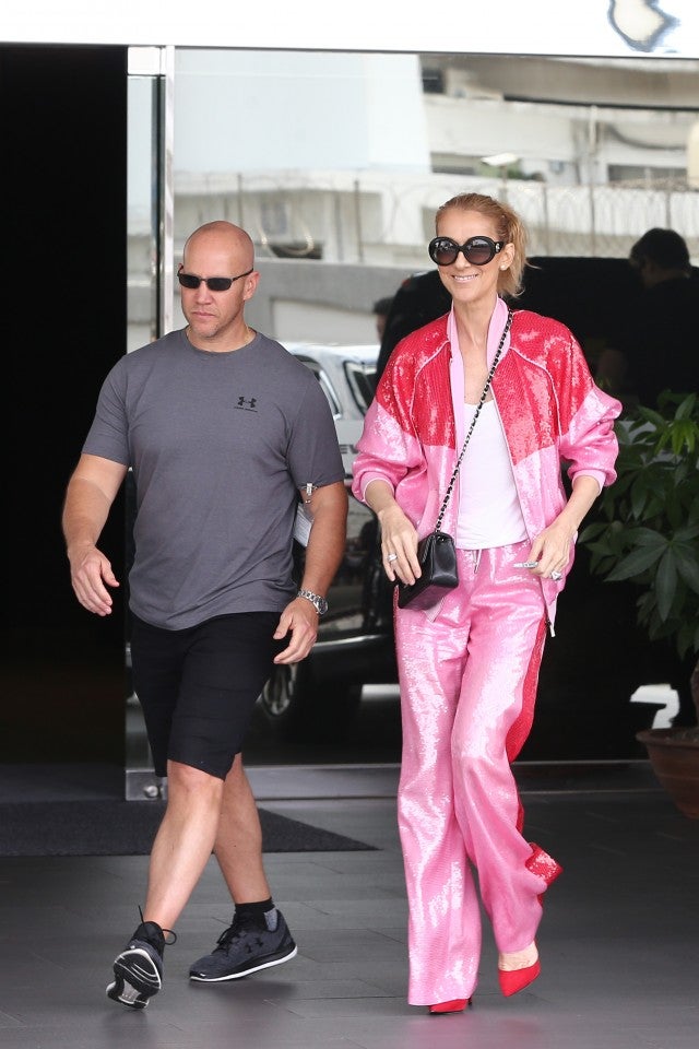While most of us resort to leggings and a comfy sweatshirt to the airport, the French-Canadian singer arrives to Taipei in a sequin pink Alberta Ferretti tracksuit, Le Silla red pumps and Chanel quilted cross-body bag.