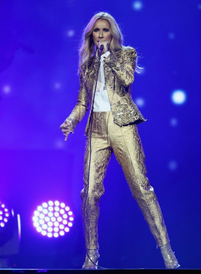 Dion kicked off her Australian tour in Sydney decked in gold via a gilded brocade pantsuit by Schiaparelli.