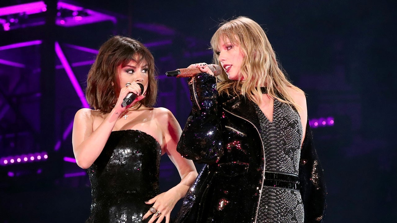 For her on-stage moment, Gomez rocked a black sequin jumpsuit and Swift rocked a gray snakeskin bodysuit with a black leather jacket and thigh-high boots.