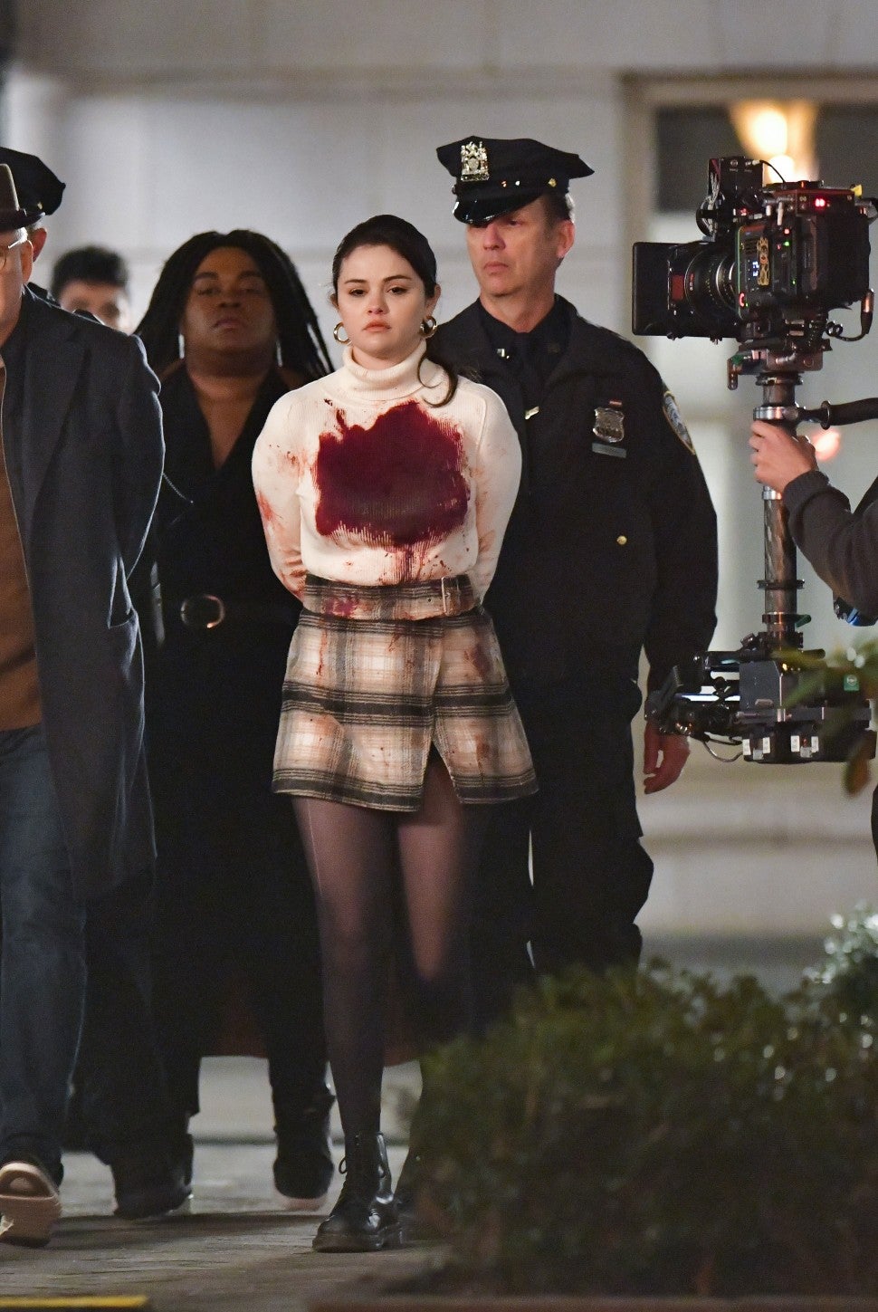 Gomez rocked an ivory sweater smeared with a massive amount of fake blood, as she was escorted out of an apartment building while filming on Saturday evening.