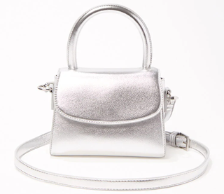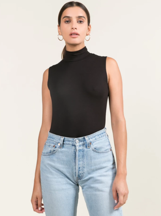 The perfect fall work outfit inspiration, the brunette beauty was polished in a sleeveless black mock neck top from Leset (it's under $100!), striped paper bag waist Miu Miu midi skirt, HVN rhinestone hoop earrings, silver metallic mini Fendi bag and black slingback pumps. She completed the look with a ponytail and bright red lip.