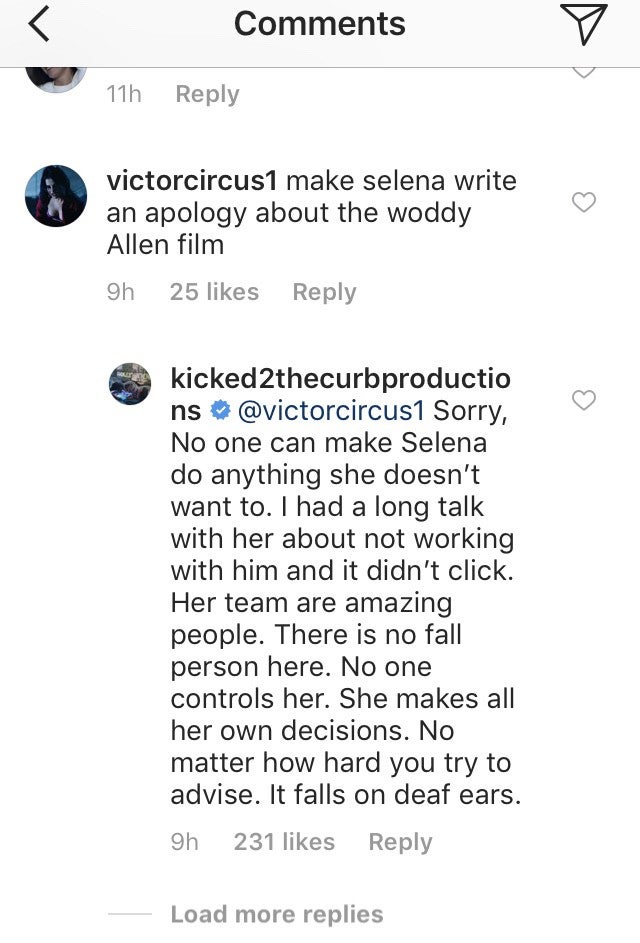 “Sorry, no one can make Selena do anything she doesn’t want to," Teefey replied. "I had a long talk with her about not working with him and it didn’t click. Her team are amazing people. There is no fall person here. No one controls her. She makes all her own decisions. No matter how hard you try to advise. It falls on deaf ears."