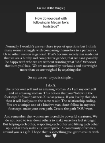 During a fan Q&A on her Instagram Stories this week, Burgess was asked how she handles "following in Megan Fox's footsteps."