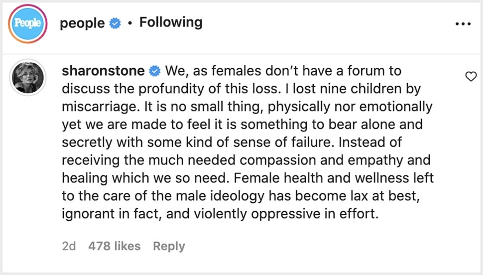 "We, as females don't have a forum to discuss the profundity of this loss," Stone wrote beneath the outlet's caption. "I lost nine children by miscarriage. It is no small thing, physically nor emotionally yet we are made to feel it is something to bear alone and secretly with some kind of sense of failure."