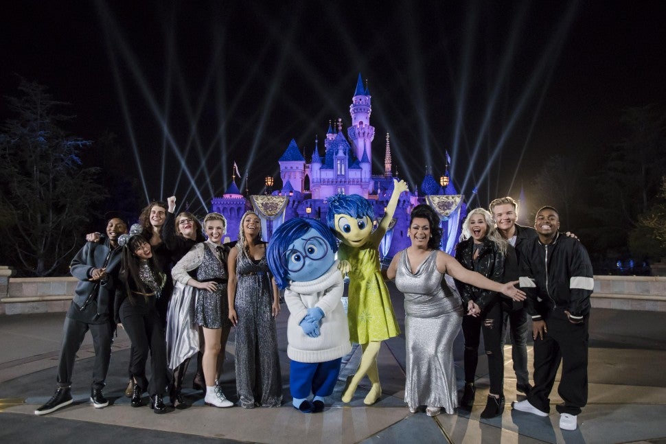 Also in Southern California, the top 10 American Idol contestants got to hang out with Joy and Sadness from the Pixar film Inside Out at Disneyland in Anaheim on April 24. The Idol hopefuls had just finished singing in front of the Sleeping Beauty Castle, a performance which will air on the ABC music competition show's "Disney Night" on April 29.