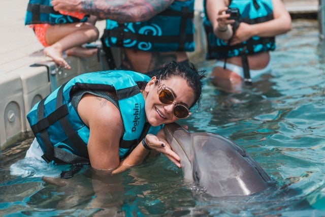 Jenni Farley took to a different kind of sandy climate with her family. After some very hectic press days for Jersey Shore: Family Vacation, "JWoww" and her family -- husband Roger Mathews, daughter Meilani and son Greyson -- took a trip to the Four Diamond Moon Palace in Jamaica, where they swam with dolphins, strolled along a private beach and rode waves on the FlowRider Double Wave Simulator.