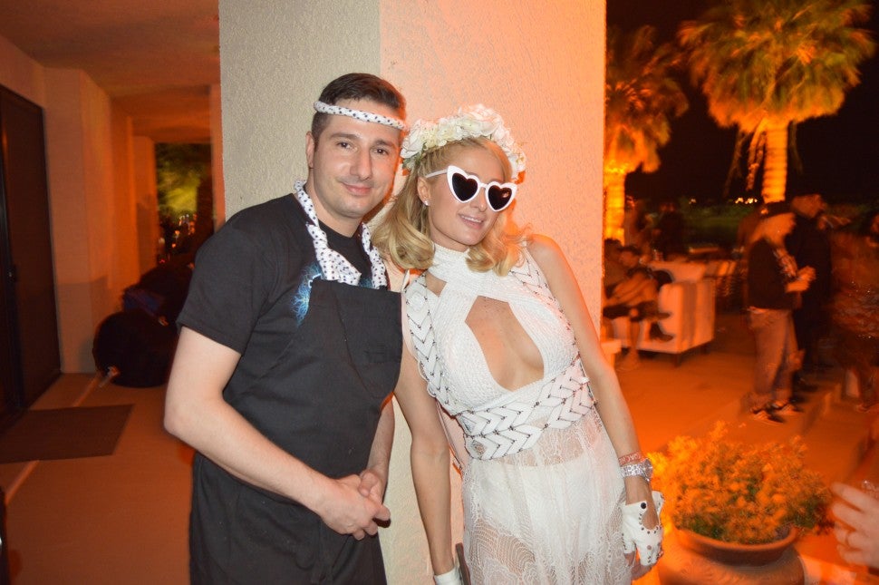 Paris Hilton met Sushi by Bou chef David Bouhadana, who was flown to Palm Springs from New York City to serve up an omakase to VIPs at 1 Oak's party at the Gravity SUV Mansion, where French Montana and Leonardo DiCaprio were also in attendance.