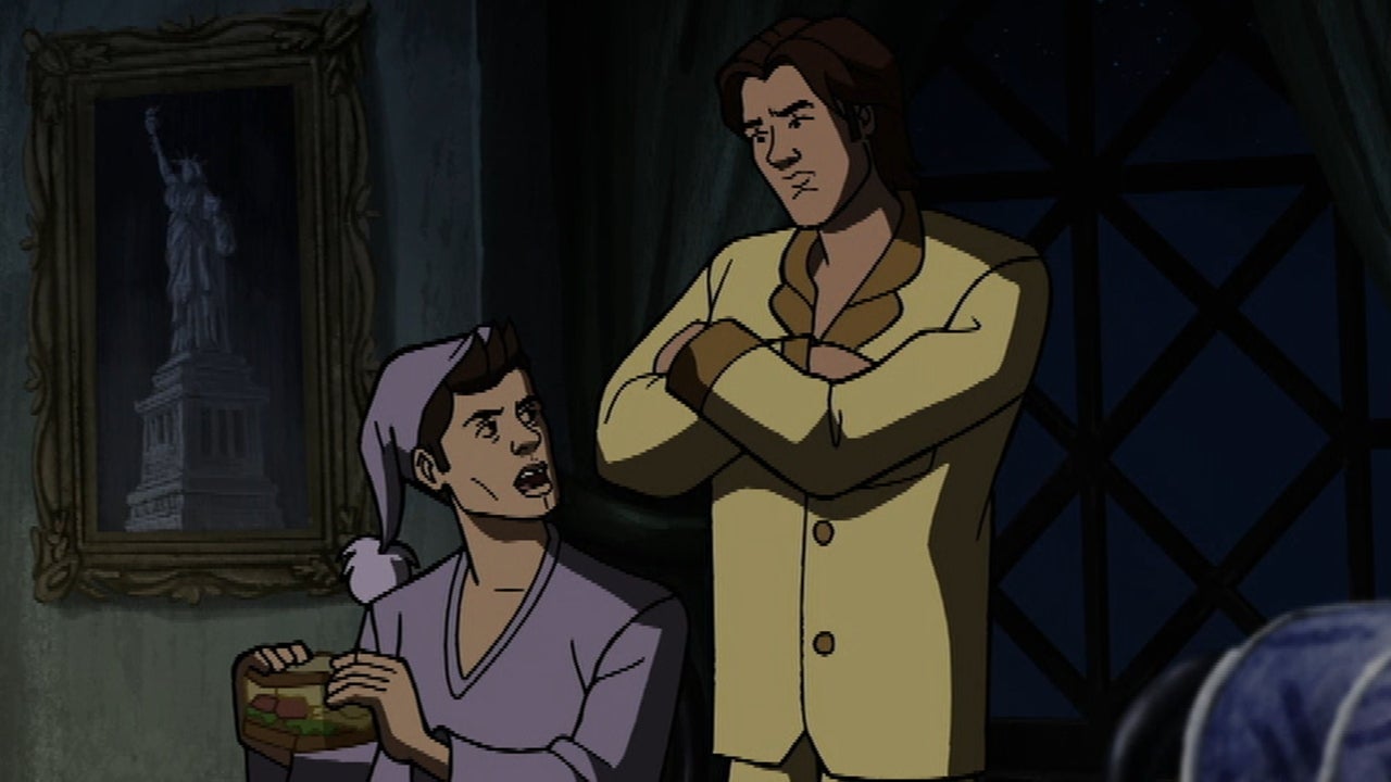 In ET's exclusive sneak peek, the brothers settle in for an evening at the Mystery Mansion with Scooby, Shaggy, Fred, Daphne and Velma, but their plans for a quiet night are derailed when they hear a scream from down the hallway. Sam and Dean, the latter forced to ditch his midnight sandwich, join the Scooby gang as they race to see what's causing all the commotion.