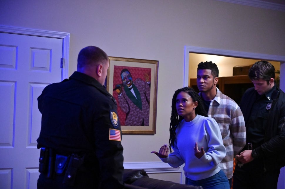In the clip, Karen Drexler (Manning) is having dinner with her new neighbors, community activist Malik (Cory Hardrict) and his wife Imani (Jasmine Burke), and the couple's friends. Malik and his friends discuss the recent murder of a man by the police, with one of them pointedly noting that "Black lives matter." When Karen asks, "don't all lives matter," the conversation devolves into a debate on the police and Karen's microaggressions against Black people.