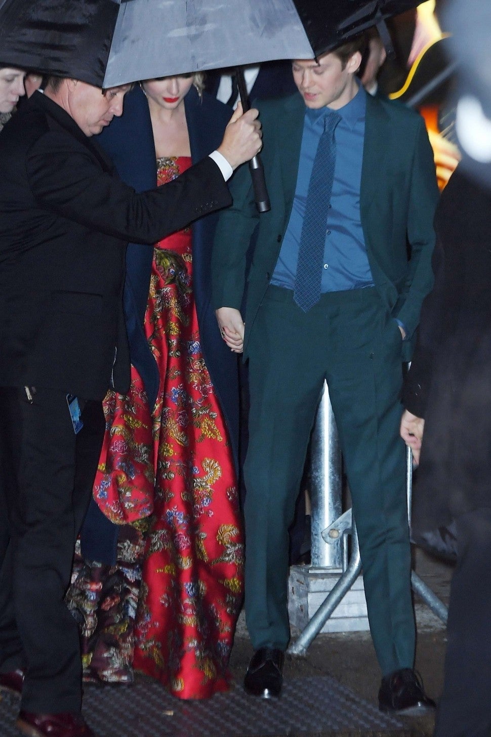 The Lover songstress -- who stunned at the premiere in a floral, ruby Oscar de la Renta satin gown -- was photographed heading out with her beau by her side, as they were shielded from the rain by men holding umbrellas.