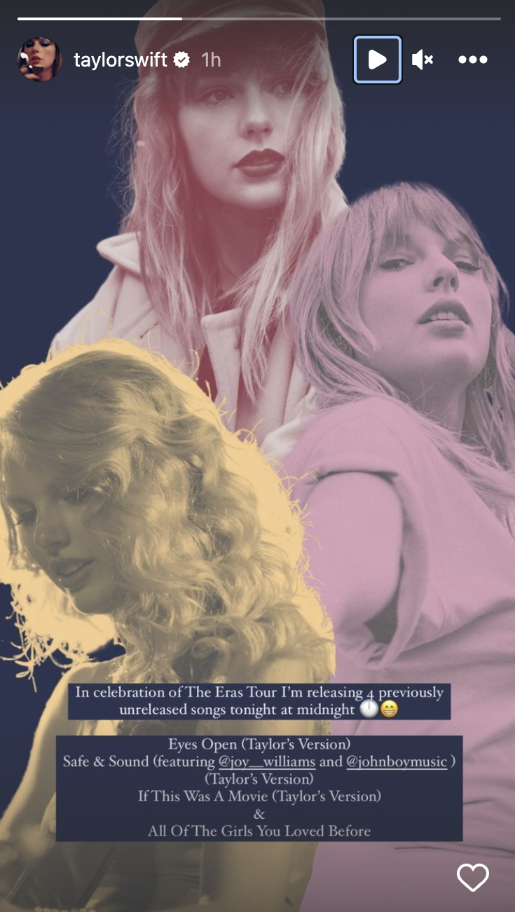 The Midnights songstress previously announced the news on her Instagram Story, saying that in celebration of The Eras Tour kicking off Friday in Glendale, Arizona, she'll be releasing "Eyes Open (Taylor's Version)," "Safe & Sound (Taylor's Version)," "If This Was a Movie (Taylor's Version)" and the never-before-heard track, "All of the Girls You Loved Before."