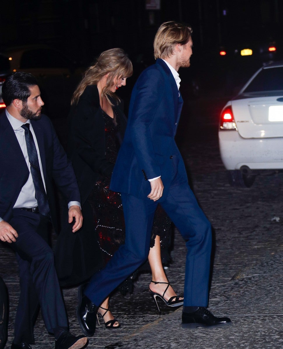 Swift, 28, didn't walk the red carpet, but was spotted exiting the theater through a back door. She accessorized her look with Jimmy Choo heels, a Christian Louboutin bag and Eva Fehren jewelry. Swift and Alwyn, 27, linked up outside, and headed home together.