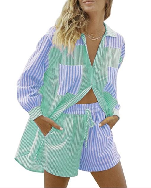 This cotton two-piece outfit will keep you looking stylish and feeling comfortable all season long. Plus, pair it with white sneakers or neutral sandals for a fashionable spring outfit.