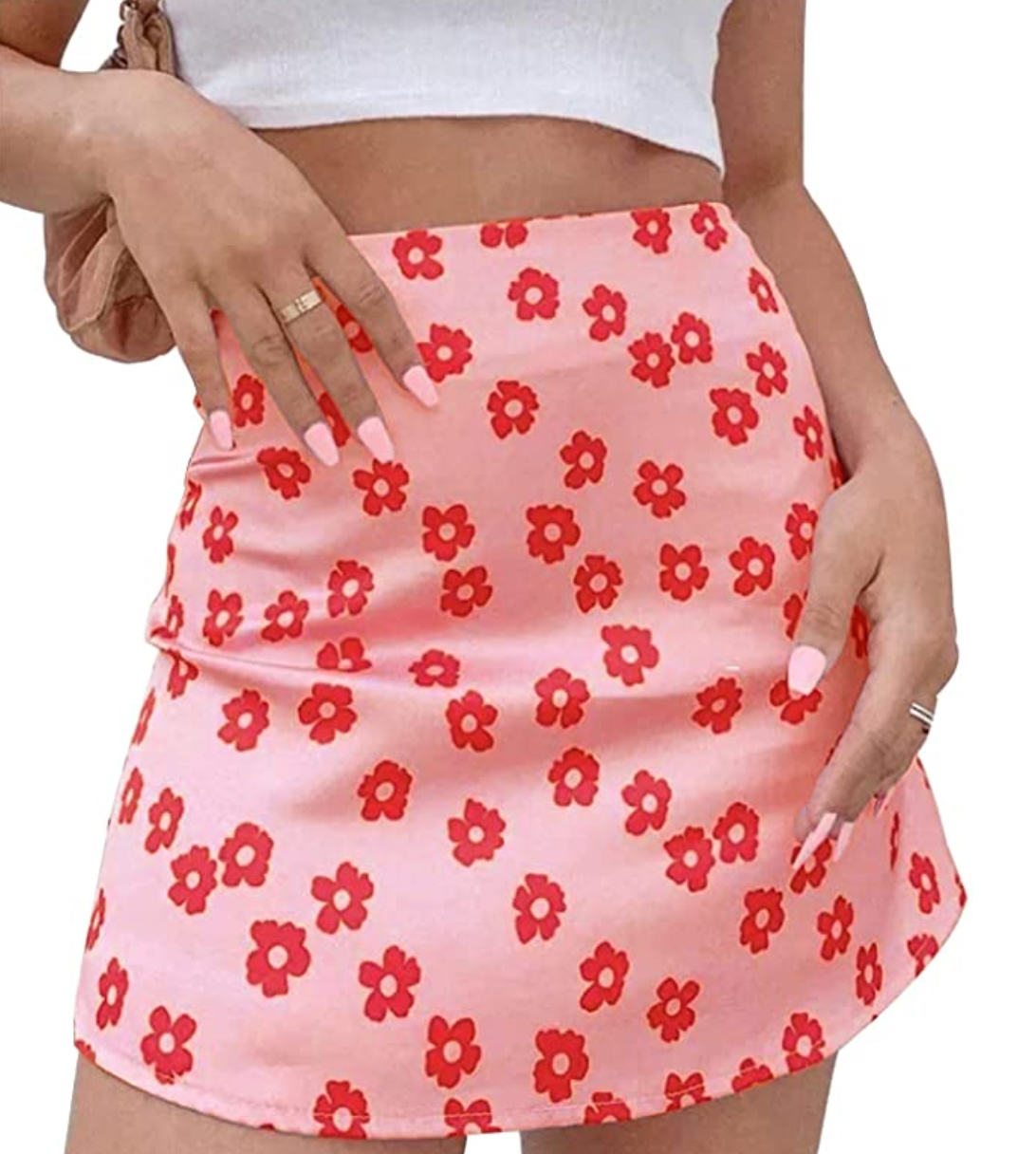 Flower power styles are alive and well — and this pink and red mini skirt from Amazon is full-proof of that.