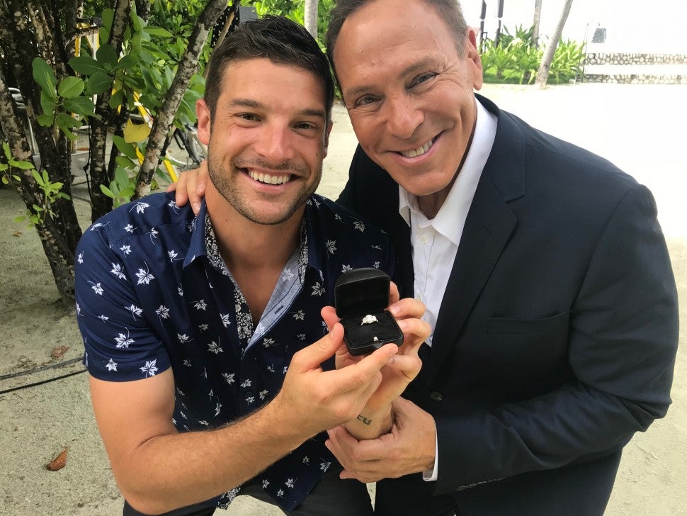 Designed and signed by the official jeweler of The Bachelor franchise, the 18-karat gold three-stone engagement ring features an oval center stone framed by two oval-cut diamonds on a diamond studded band, for a total weight of 3.76 carats.