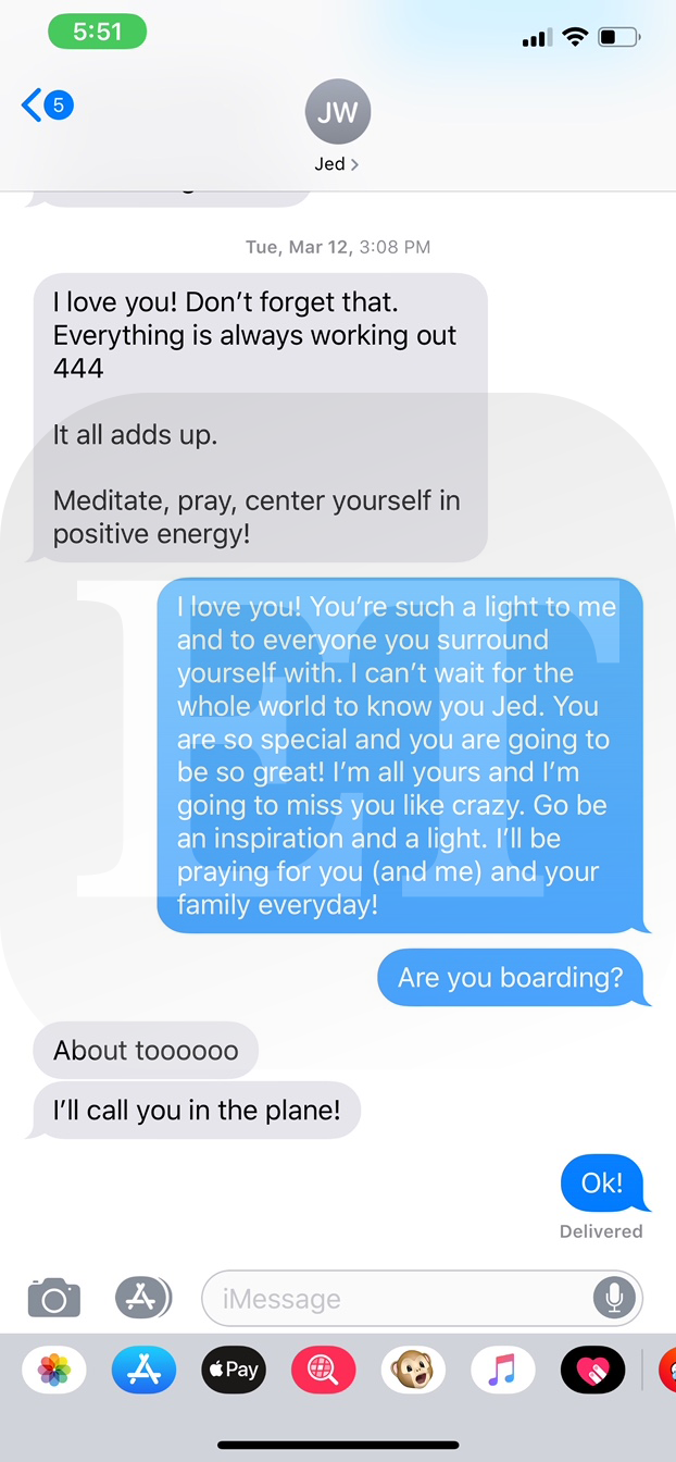 In her reply to the message, Stevens texts back, "I love you! You're such a light to me and to everyone you surround yourself with. I can't wait for the whole world to know you Jed. You are so special and you are going to be so great! I'm all yours and I'm going to miss you like crazy. Go be an inspiration and a light. I'll be praying for you (and me) and your family everyday!"
