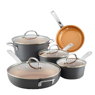 This Rachael Ray nonstick cookware set is crafted from tough hard-anodized aluminum for swift, even heat and long-lasting cooking performance.