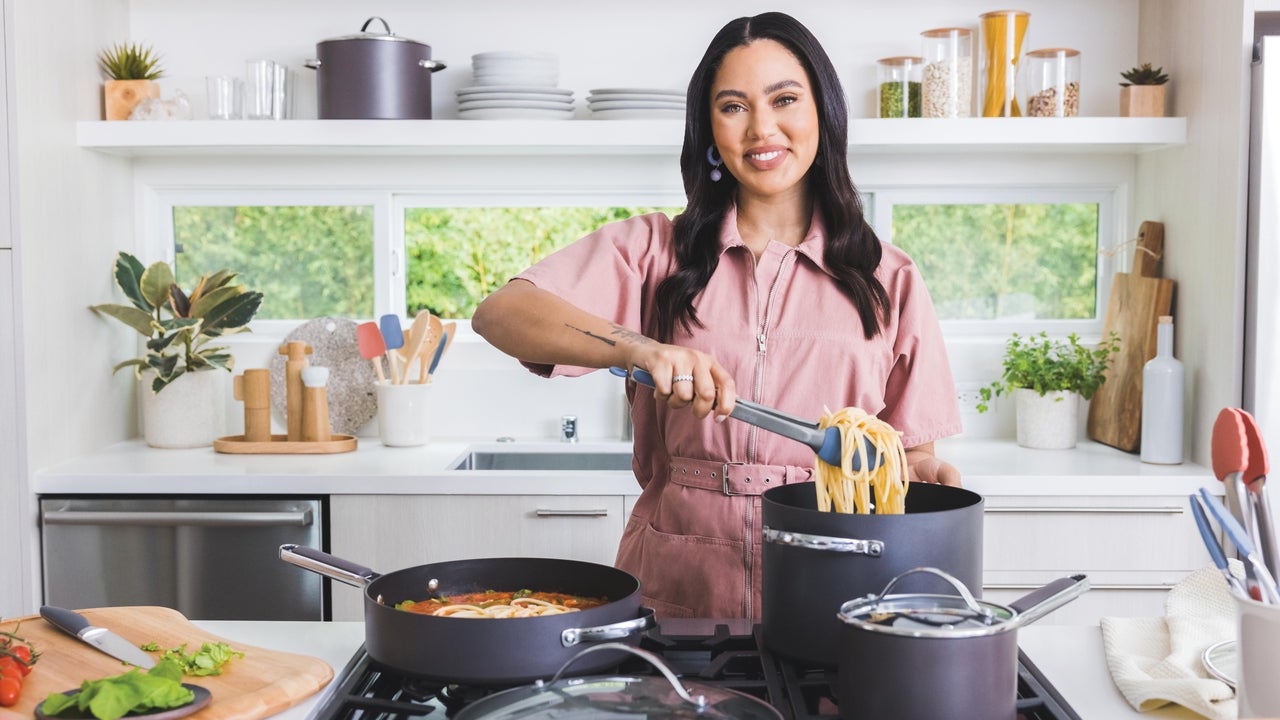 Rachael Ray's 8-Piece Create Delicious cookware set features PlatinumShield enhanced silver nonstick for effortless food release and long-lasting durability.