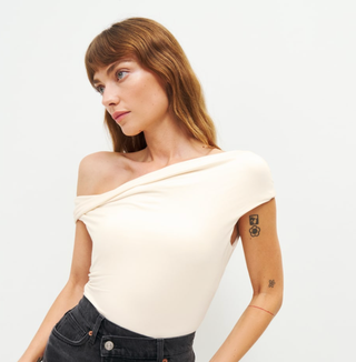 An asymmetrical neckline gives this knit top an extra sultry shape.